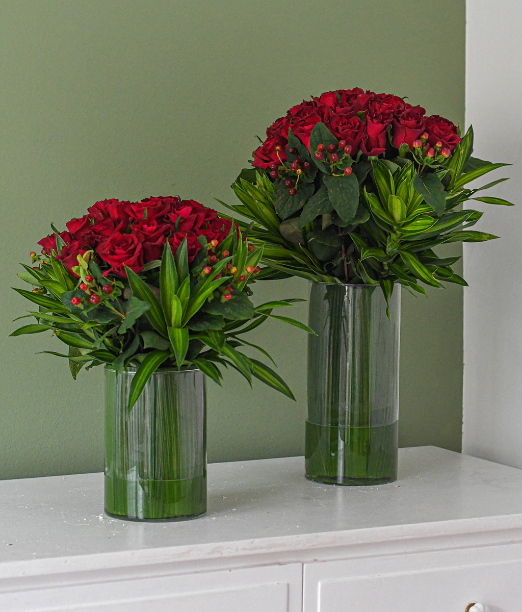 Arranjo em vaso de vidro contendo rosas vermelhas e folhagens cultivadas em nosso sítio de Guapimirim.