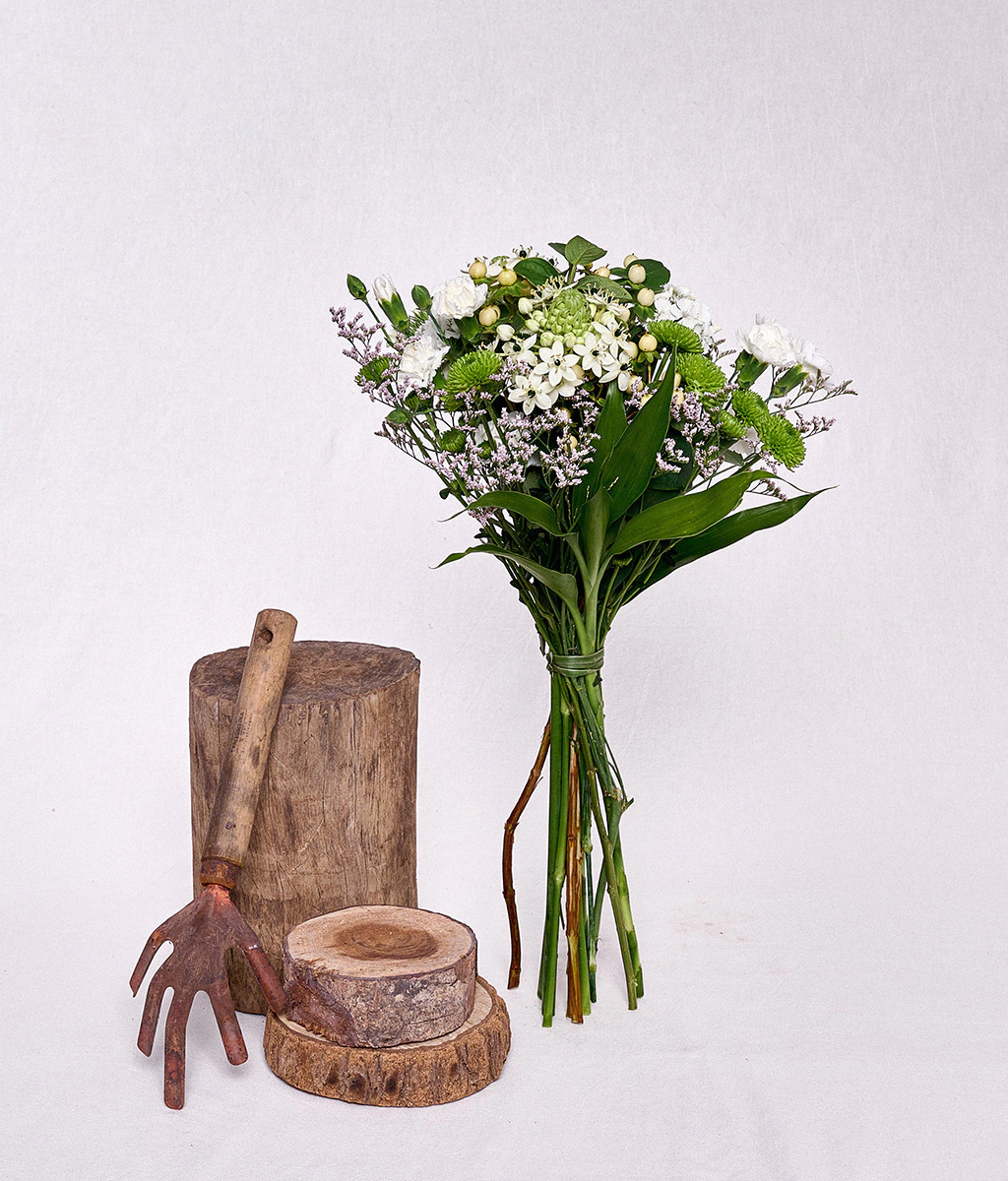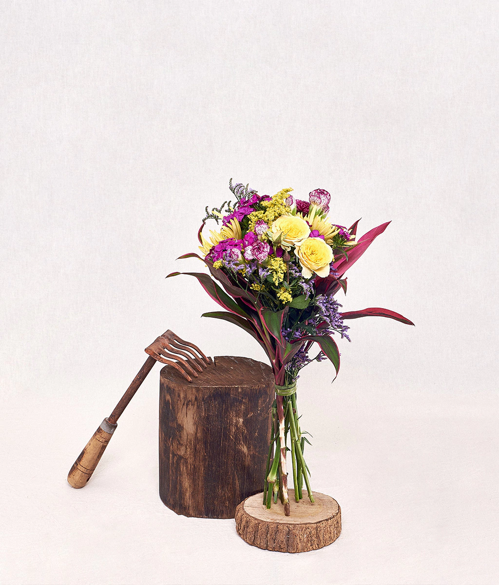 Buquê em embalagem exclusiva e sustentável, contendo de 6 a 9 hastes de flores frescas da estação e folhagens produzidas em nosso sítio de Guapimirim.